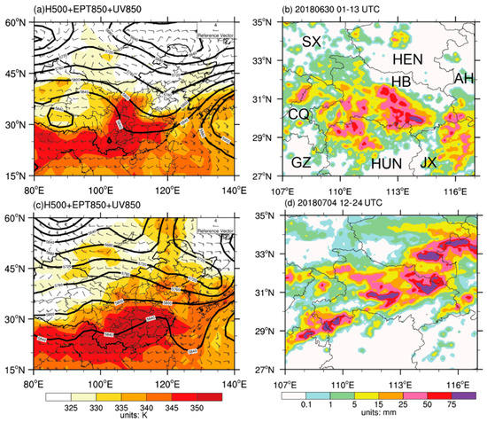 ERA-Interim reanalysis data at (a) 0000 UTC 30 June 2018 and (c)1200 UTC 4 July, with geopotential height at 500 hPa (black solid contoured at intervals 40 gpm), and equivalent potential temperature at 850 hPa (shaded; K), superimposed with wind vectors (unit: m/s) at 850 hPa in (a) and (c). The 12-h accumulated precipitation during 01-13 UTC 30 June and 12–24 UTC 4 July is shown in (b) and (d), respectively. The symbols SX, CQ, GZ, HEN, HB, HUN, AH, and JX in the Figure 1b stand for Shan’xi, Chongqing, Guizhou, Henan, Hubei, Hunan, Anhui, and Jiangxi province, respectively.