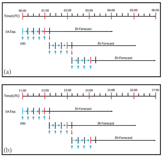 Illustration of data assimilation cycles and forecast cycles used for (a) Case 1 and (b) Case 2. ‘OBS’ represents the assimilated observations, such as radar velocity and reflectivity, and the pseudo- observations. The observations were assimilated every 15 min, and 3-h forecast launched at 01:00 UTC (12:00 UTC), 02:00 UTC (13:00 UTC) and 03:00 UTC (14:00 UTC) for Case 1 (2). The vertical blue arrows indicate the times at which the observations were assimilated.