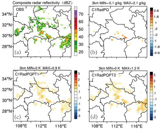 First, we discuss the impact of assimilating the pseudo- qv and pseudo- θ observations on the analysis fields for this case. The water vapor increment areas for experiment C1RadPQ at the center of the model domain exist where large observed radar echoes appear (Figure 4a vs. Figure 4b) with a maximum value for qv increment about 2.1 g kg−1 and minimum value of about −0.1 g kg−1. Qv increments for both C1RadPQPT1 and C1RadPQPT2 have very similar patterns as the C1RadPQ at this time (not shown). As for θ, the increments have larger and wider areas than water vapor field, which is consistent with the observed reflectivity coverage in both C1RadPQPT1 and C1RadPQPT2 (Figure 4c,d). It is worth noting that the pattern of θ increments for two pseudo- θ experiments are similar but the details are not the same, e.g., C1RadPQPT2 has warmer areas in the observed strong reflectivity regions, especially at an area near the east boundary, which is mainly dominated by the stratiform precipitation. It is reasonable because the C1RadPQPT2 takes advantages of both latent heating and the moist adiabatic scheme.