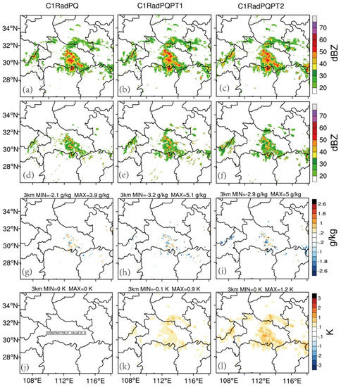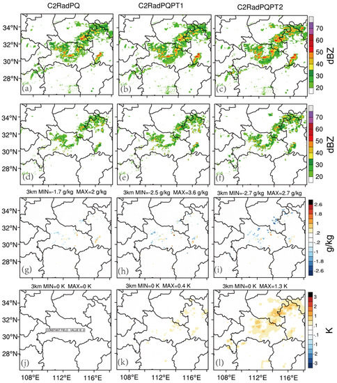 At 1400 UTC (3 h into the data assimilation cycles), the convections are weaker (stronger) in Hubei (Henan) province. The analyzed reflectivity patterns (Figure 11a–c) generally improve for background reflectivity patterns (Figure 11d–f). The qv increments for C2RadPQ, C2RadPQPT1 and C2RadPQPT2 have similar patterns, although the C2RadPQPT2 have more negative coverage areas (Figure 11g–i). The θ increments in C2RadPQPT2 (Figure 11l) are stronger and wider than that in C2RadPQPT1 (Figure 11k), similar to the first case.