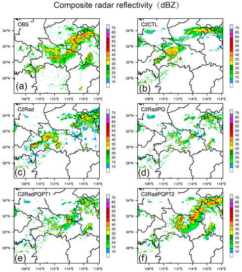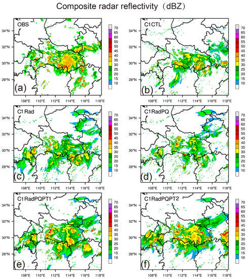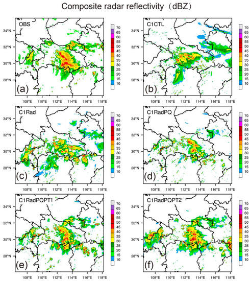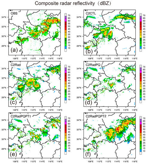At 1700 UTC, the Meiyu front rain belt was oriented northeast-southwest from Hubei to Anhui province (Figure 13a). Although C2CTL was able to capture the storm in the middle of Hubei, it was not in the right location (Figure 13b). The simulated composite reflectivity was weakest in C2RadPQ (Figure 13d), and strongest in C2RadPQPT2 (Figure 13f). None of the five experiments were able to successfully simulate the convections near (29° N, 110° E). However, C2RadPQPT2 produced the best forecast, although it over-predicted reflectivities in some areas.