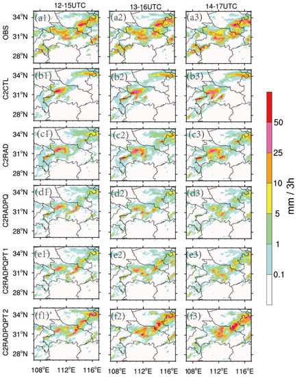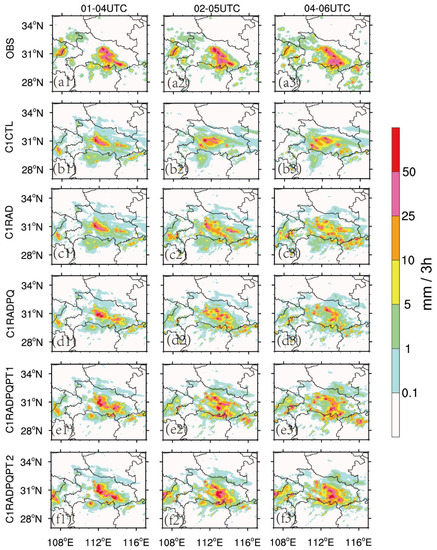 Plots of observed 3-h accumulated precipitation(a1–a3) and corresponding forecasts start from 0100 UTC (left panel), 0200 UTC (middle panel), and 0300 UTC (right panel) for the (b1–b3) C1CTL, (c1–c3) C1Rad, (d1–d3) C1RadPQ, (e1–e3) C1RadPQPT1, and (f1–f3) C1RadPQPT2 experiments.