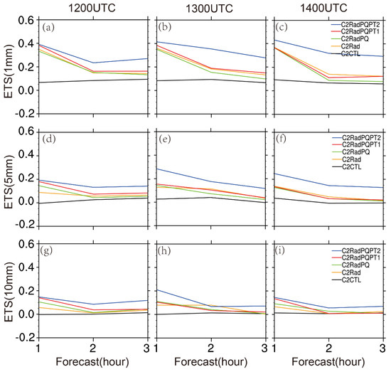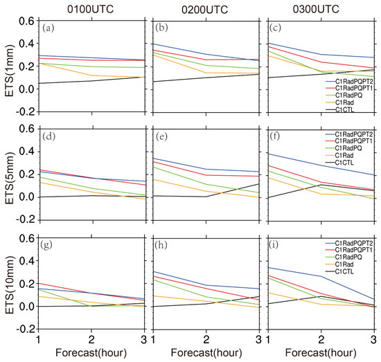 The ETS is calculated for 1-h accumulated precipitation at 1, 5, and 10 mm for the 30 June 2018 case (Figure 9). It shows that the ETS values for assimilation of both pseudo- qv and pseudo- θ in C1RadPQPT2 are superior for almost all 0–3 h forecasts, except that the forecast for the first cycle for 5 mm and 10 mm precipitation thresholds. In general, all experiments with either pseudo-qv only or both pseudo- qv and pseudo- potential temperature improve QPF.