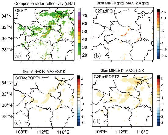 Similar to Case 1, the analyzed qv increments for C2RadPQ, θ increments for C2RadPQPT1 and C2RadPQPT2, and the observed composited reflectivity at 3 km above-ground-level (AGL) for 1100 UTC are shown in Figure 10. The large water vapor (qv) increments for C2RadPQ is mainly located at the center of the model domain, where large observed radar echoes exist (>35 dBZ) with maximum value about 2.4 g kg−1 (Figure 10b). The areas for θ increments in the C2RadPQPT1 roughly collocate with the areas for composite reflectivities with values larger than 35 dBZ, while the areas for θ increments in C2RadPQPT2 are wider and bigger than that in C2RadPQPT1. This is quite similar to the first case.