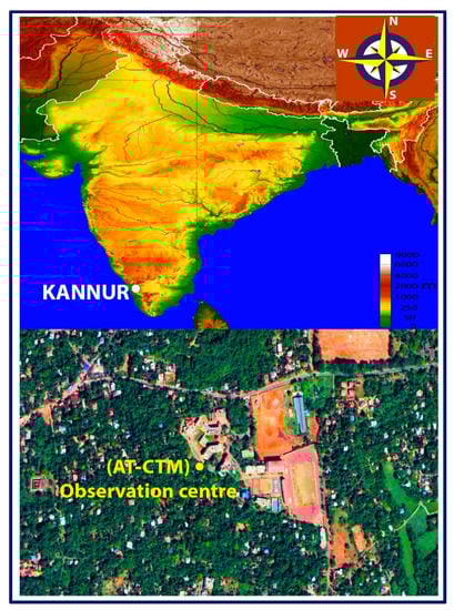 The observational site at Kannur is shown in Figure 1. Measurements of the concentrations of O3 and NOx originally started in December 2009 at Kannur University Campus (KUC); however, complete sets of data was obtained during the years January 2013 through December 2018 and are presented in this review. The measurement site is rural with limited industrial activities and is an ideal place to look at a growing semi-urban environment in India. The measurements of surface O3 (5 min interval) were made using a continuous O3 analyzer (Model O342M) with a detection limit of 0.4 ppbv. Its measurement principle is based on O3 detection by direct absorption in UV light. The O3 absorption spectrum is intense in the 250 and 270 nm wavelength range. Thus, it corresponds to the maximum range of O3 absorption at 255 nm. NO and NO2 were monitored with the aid of a nitrogen monoxide and nitrogen dioxide analyzer (Model AC32M) specific to low concentrations in the ambient air with a detection limit of 0.4 ppbv. Its measurement principle is based on the NO chemiluminescence in the presence of highly oxidizing O3 molecules. The NO in the ambient air is oxidized by O3 to form excited NO2 molecules. The concentrations of NO and NO2 were measured based on the spectrum of the radiation emitted by NO2 molecules at the excited level. More details about the observational site and the ground-based gas analyzers (Environment SA, France) used for this study were already reported by us earlier [59,65]. The weather parameters at the observational site was retrieved from the local automatic weather station established by the ISRO.