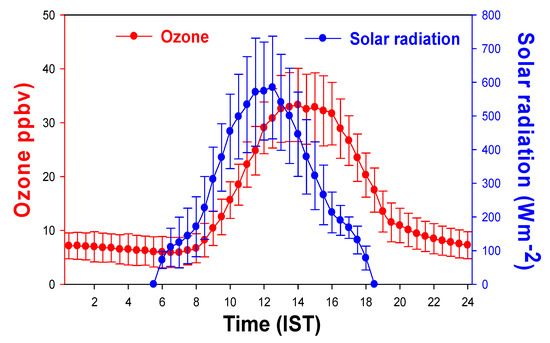 The daytime increase in O3 concentration at the observational site is due to the active photochemistry of O3 precursors, Boundary Layer Height (BLH) variations, regional emissions, and changes in weather patterns. This type of O3 variation at urban and rural sites is attributed to the daytime in situ photochemical production from its precursor gases [70]. The diurnal variations of O3 and solar radiation is shown in Figure 2. From the figure, it is clear that the surface O3 concentrations gradually increasing after sunrise, attaining an extreme concentration during noontime and declining during night time. The enhancement in the O3 concentration relative to the increase in solar radiation indicates an active photochemical reaction in the presence of solar radiation. In our observation, it is found that the concentration of surface O3 reaches its peak value in the noon time, 30 min after the maximum intensity of solar radiation.