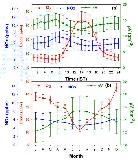 (a) Diurnal, (b) monthly variation of O3, NOx, and water content for the period January 2013–December 2018.