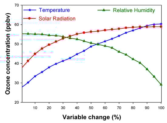 Neural network output for O3 concentration with respect to the variation of temperature, solar radiation, and relative humidity.