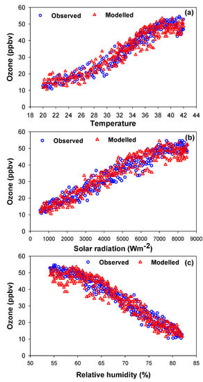 Scatter plot showing the correlations among (a) observed temperature, (b) solar radiation, and (c) relative humidity with observed and modelled ozone.