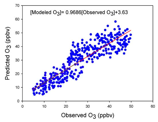 Figure 6 shows the relationship between the observed daytime maximum O3 concentrations and the corresponding model predicted O3 concentrations. The lower observed concentrations yielded lower simulated results and higher simulated concentrations at observed higher values. The model-simulated output O3 concentrations with the observed concentration shows a positive linear correlation with the correlation coefficient (r = 0.89). It can be observed that given the values of other available parameters, the accuracy of the modeled output can be greatly improved. Since O3 formation is a nonlinear process involving complex reactions, it is clear that the use of an ANN model offers greater consistency and a high degree of accuracy on O3 modeling using different forecasters.