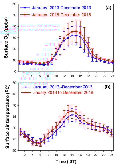 Figure 7a indicates the assessment of the annual average 24 h variations of O3 observed from January–December 2013 and from January–December 2018. The average diurnal variation of O3 on a yearly basis is computed for every hour from January to December. The average diurnal variation of O3 in 2013 shows the extreme mixing ratio (31.97 ± 8.52) ppbv at 15:00, and in 2018, it shows a maximum (35.47 ± 10.5) ppbv at 15:00. We also observed an increasing trend of O3 during noontime in 2018 as compared to 2013, and the increase is 10.94%. The corresponding minimum of O3 mixing ratio (6.22 ± 0.84) and (7.46 ± 0.9.7) ppbv was observed at 07:00 in the morning of respective years. The favorable meteorological conditions for the formation of O3 are intense solar radiation, low wind speed, shallow boundary layer height, and a high surface air temperature. The mean air temperature at any location depends on various factors, among which latitude, altitude, proximity to the sea, temperature of the sea, and exposure are the major ones [94].