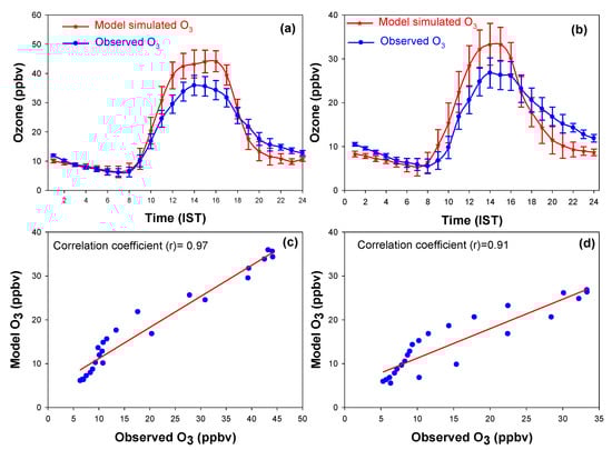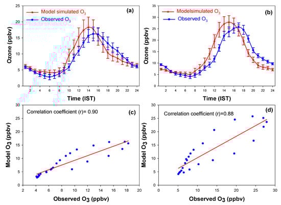 Diurnal variation of measured (averaged over the period 2013–2018) and modeled O3 for (a) monsoon, (b) post monsoon, and (c) scatter plot showing the correlation between model O3 and measured O3 for monsoon, (d) post monsoon.