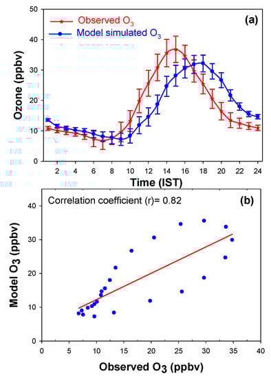 The annual average diurnal variation of O3 and its model-simulated variation is shown in Figure 10a. The model-simulated O3 variation is well-matched with the diurnal profile of observed O3. The correlation coefficient existing between the modeled simulation and the observed profile is r = 0.82, and it is shown in the Figure 10b. The results from the model simulation confirm that winter has a maximum concentration followed by summer and the post monsoon; and there is less concentration in the monsoon season. The model result shows that the O3 produced and decayed in the atmosphere of Kannur is mainly due to the photochemical reactions involving precursors. It can be seen that the increase in surface air temperature, solar radiation, and the variations in BLH also significantly affect the O3 levels during the daytime. In the model simulation, we were not able to include the transport of ozone and its precursors. Thus, the model output gives the production of ozone and its destruction employing chemical reactions only. Possibly, the observed and modeled shift may be due to the transport effect or the influence of other parameters that are currently not observed over the location.