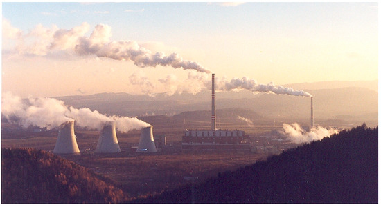 Czechoslovakia’s economy from the Second World War through the early 1980s grew at the expense of severe degradation of its natural sources and environment [1,2,3]. At that time, Czechoslovakia was a centrally planned economy under communist rule, with an emphasis on the massive development of heavy industries [4]. Ambient air pollution has been considered a major environmental threat since the 1950s. At this very time, large coal-combustion power plants were put into operation [5,6], emitting large quantities of sulphur dioxide (SO2), TSP, NOx and other pollutants [7]. These large emission sources with high stacks (Figure 1) were concentrated in the northwest region of Bohemia (NWR, location in map in Figure 2), in the Podkrusnohori region, adjacent to the German and Polish borders in particular, where their operation was driven by local poor-quality lignite coal with extremely high sulphur and ash content [8,9,10].