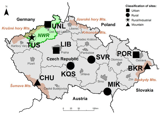 - Lomský, B.; Šrámek, V.; Novotný, R. Changes in the air pollution load in the Jizera Mts: Effects on the health status and mineral nutrition of the young Norway spruce stands. Eur. J. For. Res. 2012, 131, 757–771. [Google Scholar] [CrossRef]