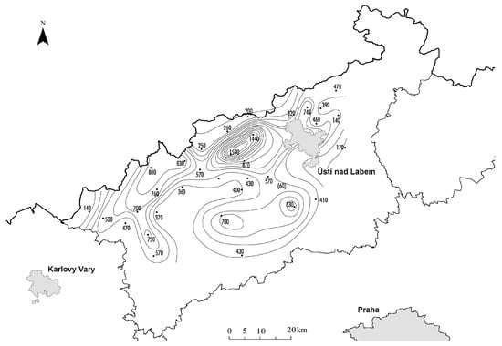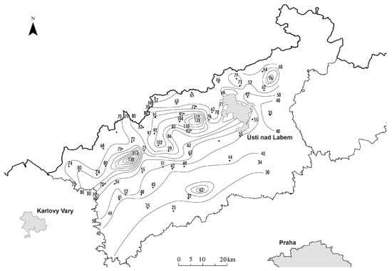 Map of Northwest Bohemia (NWR in Figure 2), showing the SO2 annual means in µg m−3 in 1971–1980, the lines represent the isoconcentrations (redrawn according to [20]).