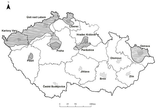 Air pollution in Czechoslovakia culminated in the 1970s and 1980s. The monitoring results from 1971–1982 for the eight most heavily impacted regions defined by the then government (i.e., North Bohemia, Mělnicko-Neratovicko, City of Prague, Hradecko-Pardubicko, Brno, West Bohemia and Pilsen) were collated by the CHMI’s internal reports [20,32,33,34,35,36,37,38]. The incorporation of a certain area into the impacted regions was based on the annual SO2 mean concentration above 30 µg m−3 (Figure 5). Based on monitoring and dispersion modelling results, the above regions were categorised into three different air pollution levels: (1) the most polluted, which were the North Bohemia and Prague regions, (2) medium air pollution level—the West Bohemia, Ostravsko-Karvinsko and Mělnicko-Neratovicko regions and (3) the lowest air pollution level—the Hradecko-Pardubicko and Brno regions. Interestingly, the two most polluted regions, i.e., North Bohemia and Prague, showed similar air pollution levels, though these originated from completely different emission sources. In North Bohemia, the problem arose from large emission sources, whereas in Prague the local heating systems were the culprit. Furthermore, with respect to distinct geomorphology, both Prague and the Podkrusnohori region have been prone to frequent thermal inversion occurrence preventing pollutant dispersion [39,40,41].