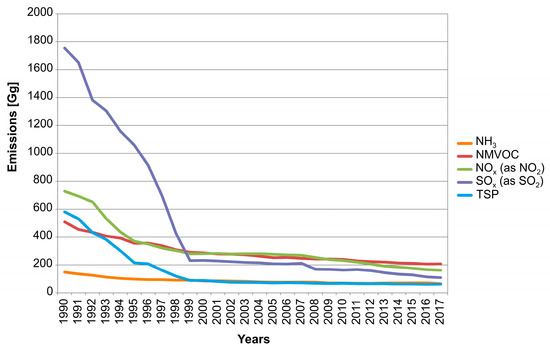 Overall emissions of SO2, NOx, NH3, NM VOC and TSP in the Czech Republic (CR), according to European Monitoring and Evaluation Programme (EMEP) data [97].