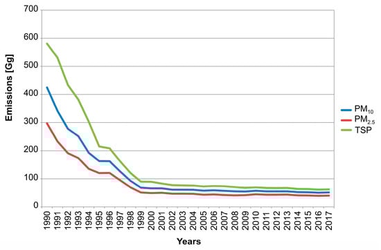 Overall emissions of TSP, PM10 and PM2.5 in the CR, according to EMEP data [97].
