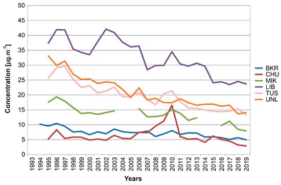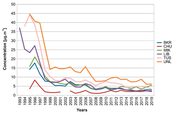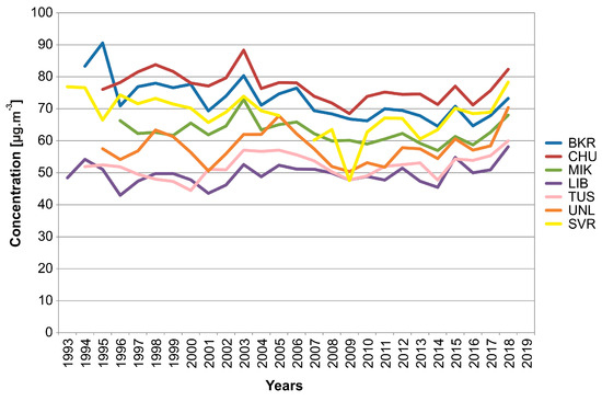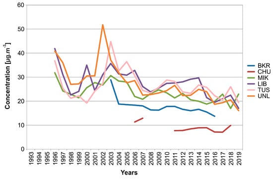 The extent to which the changes in emissions were reflected in changes in ambient air quality is shown for several sites representing different environments, altitudes and geographical regions (Table 1, location in map in Figure 2). The trends in annual mean concentrations of SO2, NOx, PM10 and O3 from the 1990s to the present time are presented in Figure 8, Figure 9, Figure 10 and Figure 11. The individual annual means are missing in cases where the requirement of a sufficient number of measured values was not fulfilled [22]. The most impressive decreases, most obvious in the presented diagram for the UNL and TUS sites (both in NWR) and the Prague site LIB were recorded for SO2 (Figure 8). The ambient NOx concentrations (Figure 9) show decreasing trends, though much milder than for SO2, with the highest concentrations for the LIB site reflecting clearly the impact of a nearby main road, and somewhat lower concentrations for the NWR sites (UNL and TUS) under influence of large thermal power plants. Fairly large differences (as compared to SO2 and PM10) between NOx concentrations at different types of sites are evident. Ambient PM10 concentrations (Figure 10) also show overall decreasing trends with peaks at the beginning of the 2000s. Annual means of ambient O3 concentrations (Figure 11) are not decreasing and show contrasting patterns to the above pollutants (Figure 8, Figure 9 and Figure 10). In accordance with the general assumption, the highest values were recorded at the CHU and BKR mountain sites, whereas the lowest values were measured at the Prague LIB site.