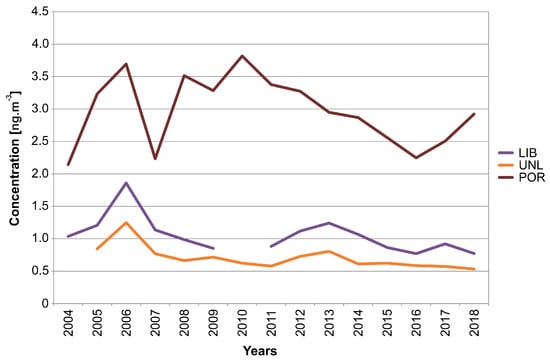 Aerosol, or suspended particles, is considered to be a major air pollution problem in the CR, similarly to elsewhere [106]. According to the latest annual report [22] providing an assessment of ambient air quality based on established limit values [109], in 2018, the daily limit value of 50 µg m−3 for PM10 was exceeded over 3.2% of the entire territory of the CR (in a grid of 1 × 1 km) inhabited by approximately 14% of the population; the annual limit value of 40 µg m−3 for PM10 was exceeded at 0.1% of the entire territory of the CR with approximately 0.3% of the population. The annual limit value of 25 µg m−3 for fine fraction of PM2.5 was exceeded in 1.2% of the entire territory of the CR inhabited by approximately 6.1% of the population. The annual limit value of 1 ng m−3 for benzo[a]pyrene, an established human carcinogen [131,132] related to PM2.5 aerosol fraction and indicator of polycyclic aromatic hydrocarbons (PAHs) exposure, was exceeded in a number of cities and municipalities, on 12.6% of the entire CR territory inhabited by an astounding 35.5% of the country’s inhabitants [22]. The trends in BaP based on long-term monitoring by the CHMI at several suburban sites, representing the exposure in residential areas of Czech cities in 2004–2018 are presented in Figure 12.