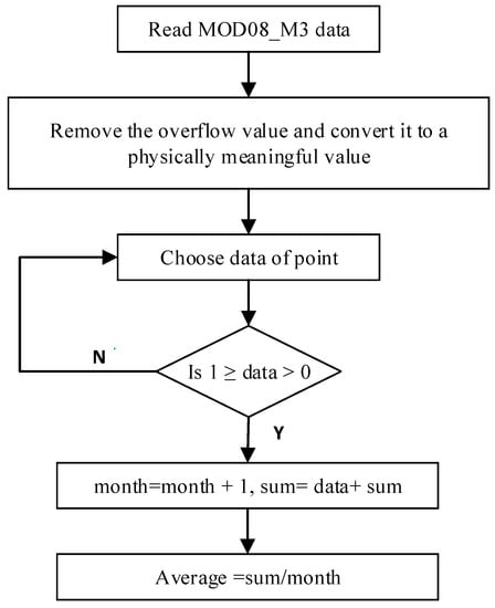 We perform the quality control for the data following the flow chart shown in Figure 1. We read data from the MODIS Level-3 monthly products, as well as the corresponding valid range and scale factor, then remove the meaningless data based on the valid range and convert it to a meaningful cirrus reflectance. If the cirrus reflectance is in the range of 0~1, the value of month equals the month plus one and sum equals sum plus the data. Finally, we can get the average cirrus reflectance. According to Figure 1, cirrus reflectance corresponding to latitude, longitude, and time can be obtained for analyzing the distribution and variation of global cirrus clouds.