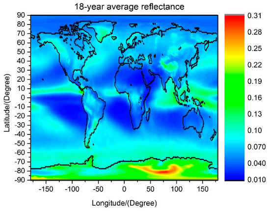 In order to analyze the variation of the cirrus reflectance, statistical analysis based on the 18 years data for each Hemisphere is performed. In this paper, a linear fitting method is used to analyze the trend of cirrus reflectance over time. As shown in Figure 5, the yearly-average cirrus reflectance in the Southern Hemisphere is significantly larger than in the Northern Hemisphere. There is a slightly decreasing tendency for the yearly-average cirrus reflectance at each Hemisphere, the slopes of cirrus reflectance variation in the Northern and Southern Hemisphere are −1.253 × 10−4 and −1.297 × 10−4/year, or around −0.19% and −0.16%/year, respectively. The Pearson’s R of cirrus reflectance in the Northern Hemisphere is −0.761, which means the yearly-average cirrus reflectance has a negative correlation with time. However, Pearson’s R in the Southern Hemisphere is −0.551. Figure 5 implies that the global solar radiation reflected by cirrus clouds may have a decreasing trend. In order to confirm the trend, more research on long-term observation of cirrus clouds based on satellite data and lidar is needed in the future.