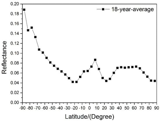 It can be seen from Figure 2 that the 18-year average cirrus reflectance varies more significantly with latitude. Thus, we perform statistical analysis on the variation of them with latitude. The latitude regions from 90 °S to 90 °N are divided into 36 latitude zones with the interval of 5°, negative values represent the Southern Hemisphere and positive values represent the Northern Hemisphere in this paper. Figure 3 shows the average values of cirrus reflectance from 2000 to 2017 at each latitude zone. The 18-year average cirrus reflectance decreases with latitude from the equator and the minimum is presented at around 20 °S region, then increases with latitude in the Southern Hemisphere until to the South Pole. For the Northern Hemisphere, two minimums of cirrus clouds reflectance are presented in the regions around 22.5 °N and the North Pole, respectively. The cirrus reflectance is smoother in the Northern Hemisphere than that in the Southern Hemisphere for the regions where the latitude is larger than 45°. Cirrus reflectance variation patterns in this figure is very different from a similar plot (Figure 6 of Liou paper) presented [31]. Different latitude grids divided lead to different latitudinal and seasonal variation of cirrus reflectance at the mid- and low-latitude regions.
