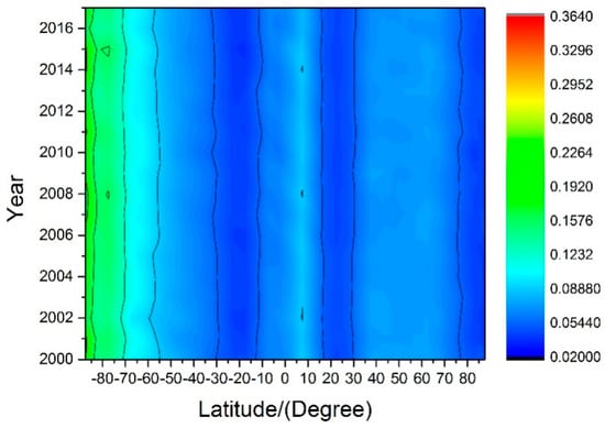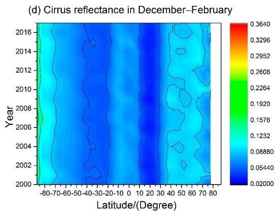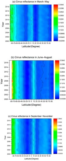 Figure 6 shows that the seasonal-average cirrus reflectance varies with latitude from 2000 to 2017. It can be seen from Figure 6a that the average cirrus reflectance from March to May can be regarded as symmetrical about 3 °N in the mid-latitude and low-latitude regions, decreases firstly and then increases from the central axis to the sides. The minimums occur near 20 °N in the Northern Hemisphere, and near 25 °S in the Southern Hemisphere, respectively, and the minimum value in the Northern Hemisphere is smaller than the Southern Hemisphere. However, at the high-latitude regions, the seasonal-average cirrus reflectance in the Southern Hemisphere increases gradually, but decreases in the Northern Hemisphere. In Figure 6, (c) is similar to (a), but for the average cirrus reflectance from September to November, the central axis in the mid-latitude and low-latitude regions is located at around 8 °N. There is no data for Figure 6b,d in the [80 °S, 90 °S], [80 °N, 90 °N] regions, respectively, because of the Polar nights or very short sunshine time. Figure 6b shows that the average cirrus reflectance varies with latitude from June to August. From 10 °N to 75 °S, the cirrus reflectance decreases firstly and then increases. The minimum value is near the 15 °S, but from 10 °N to 90 °N, the variation of seasonal-average cirrus reflectance is gentle, especially for the mid-latitude regions, the cirrus reflectance varies very slowly. Figure 6d describes that the average cirrus reflectance from December to February is symmetrical about 7.5 °S at the mid-latitude and tropical regions, and there is a tendency to decrease from the center to both sides. As shown in Figure 6, there is a large latitudinal movement of cirrus reflectance with the changing season, which is in agreement with previous [12,13]. For the mid- and high-latitude regions, the cirrus reflectance reaches the maximum in winter whether the Southern Hemisphere or the Northern Hemisphere, i.e., Southern Hemisphere: June–August, Northern Hemisphere: December–February, and varies with latitude larger in the Southern Hemisphere than in the Northern Hemisphere.