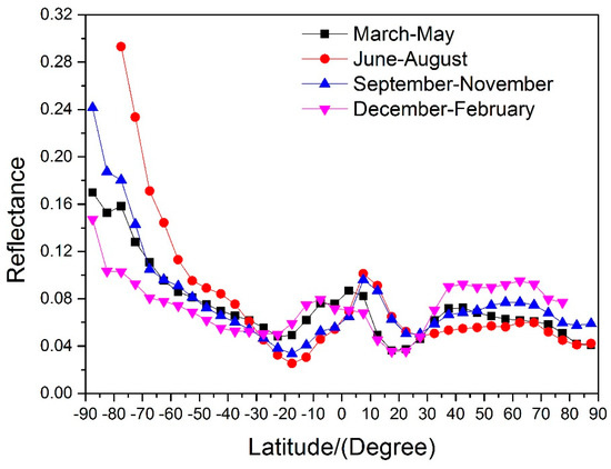 The seasonal variation of cirrus clouds is studied in this subsection. In order to analyze the variation of cirrus reflectance with the different seasons (Sprint, Summer, Autumn and Winter, see Section 2.2 for details). The variation of the average cirrus reflectance with latitude is analyzed in different seasons.