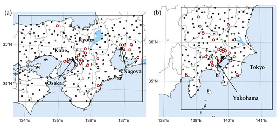 Finest model domains for J-STREAM, d03 (a) and d04 (b). d03 covers major city clusters located in western Japan including Osaka, Kobe, Kyoto, and Nagoya. d04 covers the Tokyo metropolitan area. The red circles indicate the locations of ambient air pollution monitoring stations (AAPMSs). The black circles indicate the locations of the meteorological observation stations of the Japan Meteorological Agency (JMA).