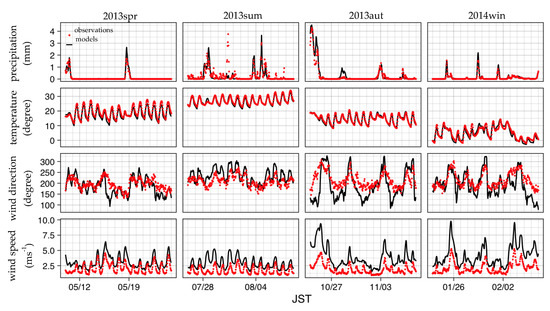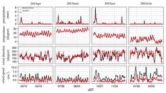 The baseline meteorological fields were compared with hourly observations of the Japan Meteorological Agency (JMA) for the observation stations within d03 and d04 (Figure 1) over four seasons: the spring of 2013 (11–26 May 2013), the summer of 2013 (27 July–10 August 2013), the autumn of 2013 (25 October–9 November 2013), and the winter of 2014 (24 January–7 February 2014) (Figure 2 and Figure 3). The hourly observed and modeled meteorological variables were averaged for all meteorological observatories for each domain.