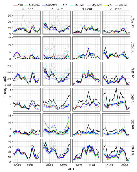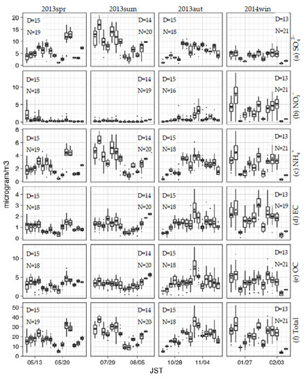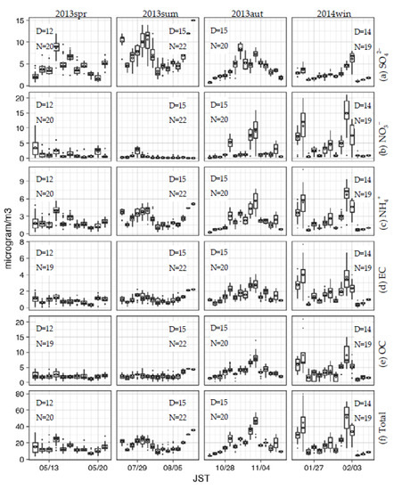 Figure 4 and Figure 5 present observed daily concentrations for PM2.5 components, i.e., SO42−, NO3−, NH4+, EC, and OC, and total PM2.5 mass for each 12- to 15-day seasonal period at the AAPMSs for d03 and d04, respectively. The box-and-whisker and black dots (outliers) means the differences between AAPMSs in each domain.
