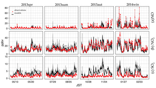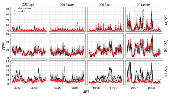 In general, most CTMs showed good agreement with the observed concentration levels of NO and NO2 for each season, with regular diurnal patterns of NO in the warmer seasons. However, none of the models fully reproduced the elevated concentrations, e.g., for 19–20 May and 3 November (NO and NO2) and 30 January (NO), with differences of 50%–200% between the observations and models, among others; the models tend to overestimate the observed daily maximums of NO: around 10–20 ppbv in spring and around 10–30 ppbv in summer, by a factor of 2.