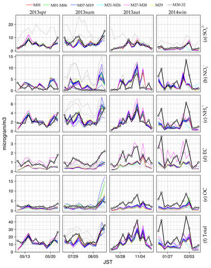 Spatially averaged concentrations of PM2.5: (a) SO42−, (b) NO3−, (c) NH4+, (d) EC, (e) OC, and (f) total PM2.5 over the four seasons. These results are based on daily concentrations observed and simulated for AAPMSs in d04. The thick solid lines with open circles present observations, and the colored lines present model results.