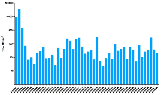 Levels of contamination by viable molds ranged from 1.67 × 10 to 3.61 × 105 CFU m−3 of air, with a mean value of 1.02 × 104 CFU m−3 and a standard deviation of 5.33 × 105 CFU m−3 (Figure 1).