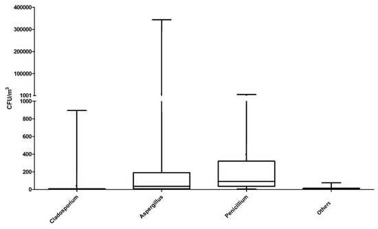 Representation of the fungal groups (Cladosporium, Aspergillus, Penicillium and others) quantified from bioaerosols. The box and whisker plots show the median percentage of fungal concentration (horizontal bars), their quartiles (box) and range (whiskers).