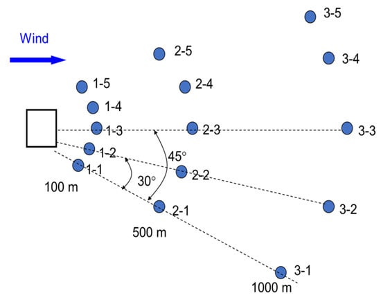 Grid for odour measurement in the field, with the positions of 15 human assessors denoted as 1–1 to 3–5 at 0°, 30°, and 45° from the wind direction at 100, 500, and 1000 m from the odour source.