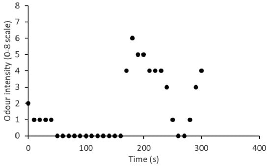 A sample of odour intensity measurements for a 5 min period, reported by a human sniffer.