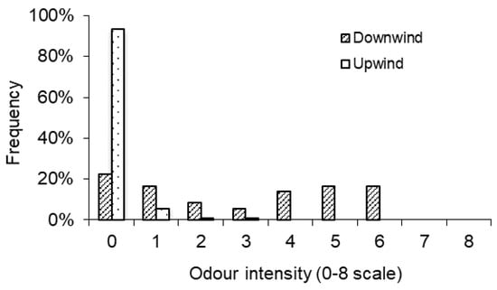 Odour intensity assessed by human sniffers upwind and downwind of the farm.