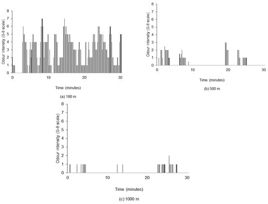 A sample of field odour intensity measurements reported by human assessors in a 30 min sniffing session at: (a) 100 m, (b) 500 m, and (c) 1000 m from odour source (August 5, Session 2).