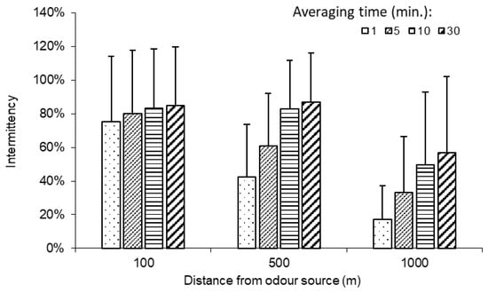 Intermittency measured along the wind direction at 100, 500, and 1000 m from odour source (bar: standard deviation).