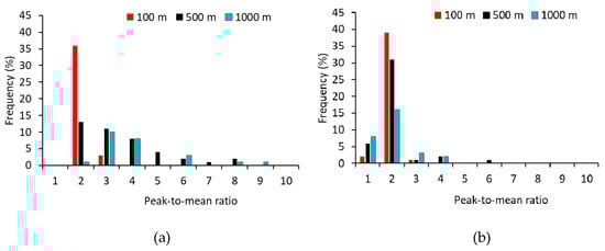 Frequency distribution of the peak-to-mean ratio of odour intensity along the wind direction at 100, 500, and 1000 m from the odour source. (a) PMR_OI (true peak-to-mean ratio of odour intensity) and (b) CPMR_OI (conditioned peak-to-mean ratio).