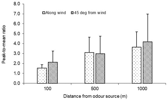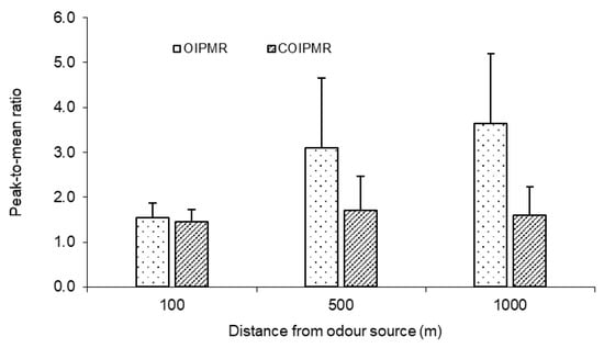 In the off-wind directions, more zero odour readings were generally recorded, and consequently, higher PMR_OIs were observed (Figure 9). Two-way ANOVA, considering the effects of the angle from the wind direction and the distance from the odour source, indicated that the angle effect on the PMR_OI was not significant (p > 0.05) at 500 m but was significant at 100 and 1000 m. The largest difference in PMR_OI between the 0° and 45° angles was about 17% (3.6 vs. 4.2) at 1000 m.
