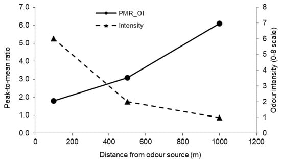 Variations of the PMR_OI (30 min averaging time) and odour intensity with distance from the odour source.