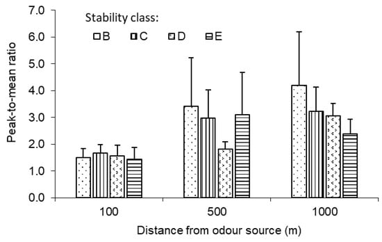 The PMR for odour from livestock operations is influenced not only by atmosphere dispersion but also source characteristics (e.g., frequent changes in odour emission rate). Best et al. [] pointed out that industrial and agricultural odour PMRs depended on source characteristics, downwind distance, and atmospheric stability. Based on the review of published literature, Schauberger et al. [] listed the following variables that influence the peak-to-mean ratio for odour: atmospheric stability; intermittency; travel time or distance from the source; lateral distance from the axis of the wake; and geometry of the source (emission height and source configuration).