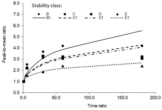 The measured PMR_OI increased with the averaging time, and the largest increase was observed at 1000 m under stability class B: from 2.5 to 4.2 when the averaging time increased from 1 to 30 min. The increase of the PMR_OI with the averaging time followed a non-linear pattern (Figure 11). Therefore, the same power function as defined in Equation (1), i.e., PMR_OI = (tm/tp)q, was used to predict the PMR_OI from the time ratio (tm/tp). To evaluate the exponent q in the equation, the PMR_OI was plotted against (tm/tp) in the log–log scale and the exponent q was determined as the slope of the regression line (Table 4). The exponent q decreased from 0.33 for stability class B (unstable) to 0.19 for E (slightly stable). The measured exponent values were lower than those reported in the literature for unstable atmosphere conditions. Smith [] gave the following q-values for three stability classes: 0.65 (stability class B), 0.52 (C), and 0.35 (D). Duffee et al. [] reported values of q being 0.50 for stability class A or B, 0.33 for C, 0.20 for D, and 0.17 for E and F.
