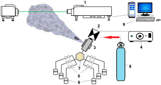 Block diagram of the automated system for the generation of fog with impurities. 1. Laser particle size analyzer, 2. electromagnetic valve, 3. nozzle, 4. spray duration control unit, 5. valves, 6. fluid containers, 7. mixing hub, 8. pressurized gas tank, and 9. PC for processing and visualizing the results.