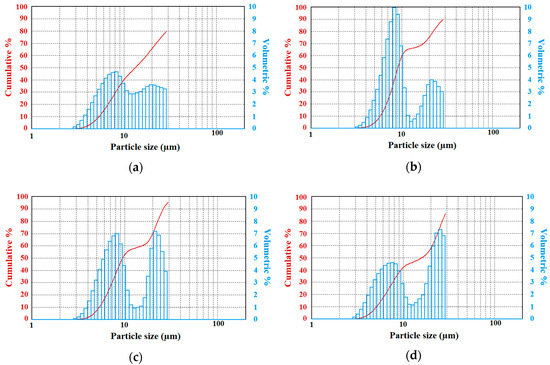 Overall, all of the PHT solutions generated droplet spectra with both bimodal and multiple peaks from 3 μm up to 30 μm. Vdt for sizes less than 30 μm was 90%, 88%, 88%, and 85% in Figure 3a–d, respectively. This means that droplet sizes generated were representative of fog droplets’ microphysical properties. With having 5% of PHT dissolved in distilled water, the Vdt for sizes < 10 μm was the highest among all the experiments. This result was similar to the Section 3.1 analysis. It is also found that increasing the volume concentration of PHT from 2.5% to 10% led to an increase of Vdt up to 5% when diameters > 30 μm.