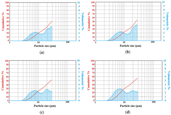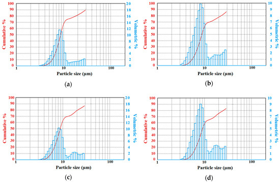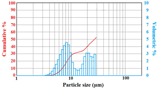 The results are provided for three chemical compounds, including potassium dihydrogen phosphate, urea, and potassium hexacyanoferrate trihydrate. Here, fog droplet spectra and calculated parameters representing tests performed for each compound are provided. In Figure 2, Figure 3, Figure 4 and Figure 5, the double y-axes representing the cumulative (red line) and volumetric percentage (histogram) of the respective group versus particle diameter are provided. Results for each chemical component are given below.